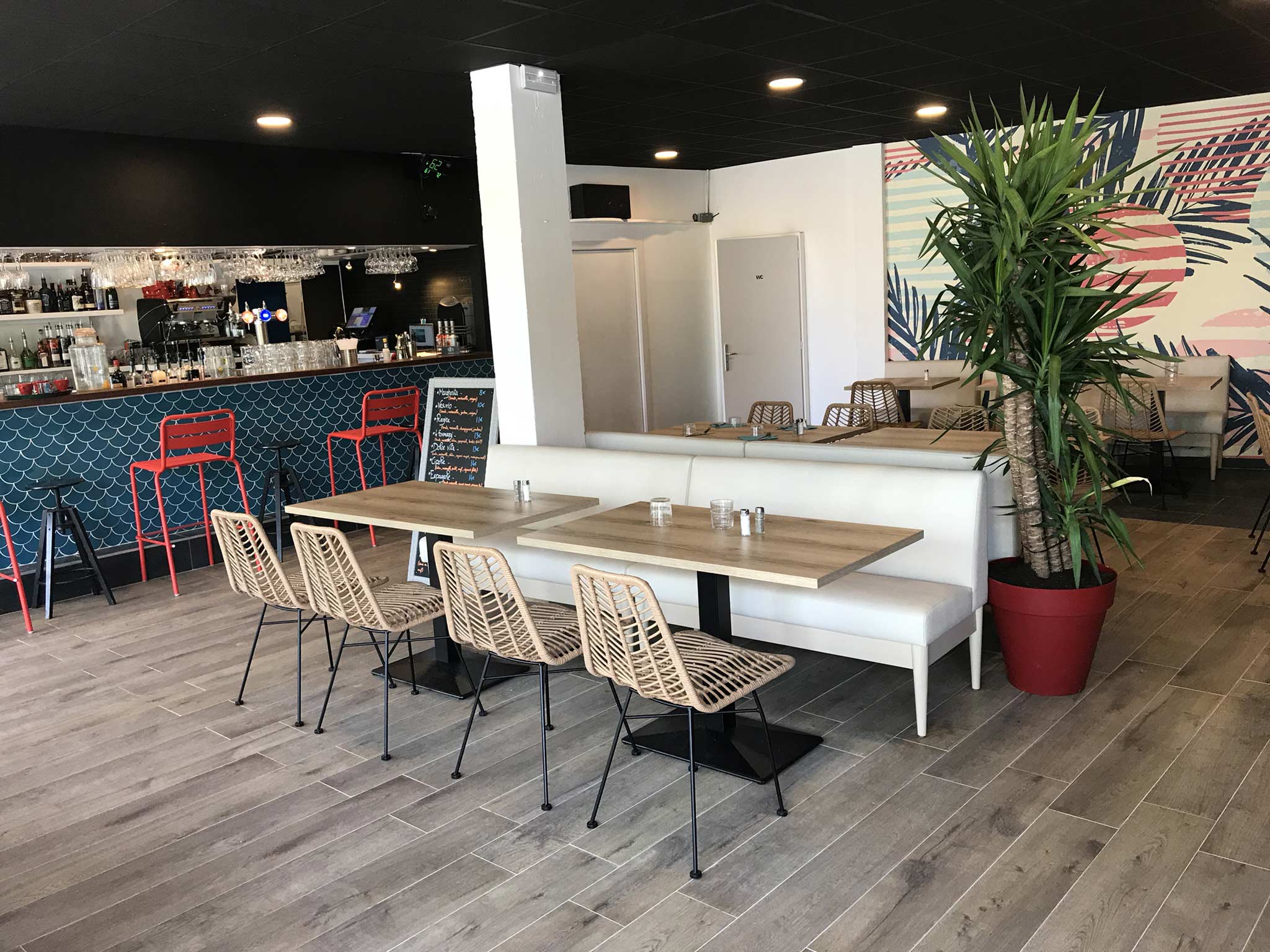 Implanté dans un joli parc boisé au cœur du Pays Basque, le camping 4 étoiles Atlantica du groupe Ciela Village est l’endroit idéal pour des vacances en famille. Notre mission ? Aménager le tout nouveau restaurant dans une ambiance marine moderne. Nous avons ainsi fait le choix d’associer de confortables banquettes à des chaises en rotin autour de jolies tables de bois. De quoi régaler ses papilles tout en étant confortablement installés !