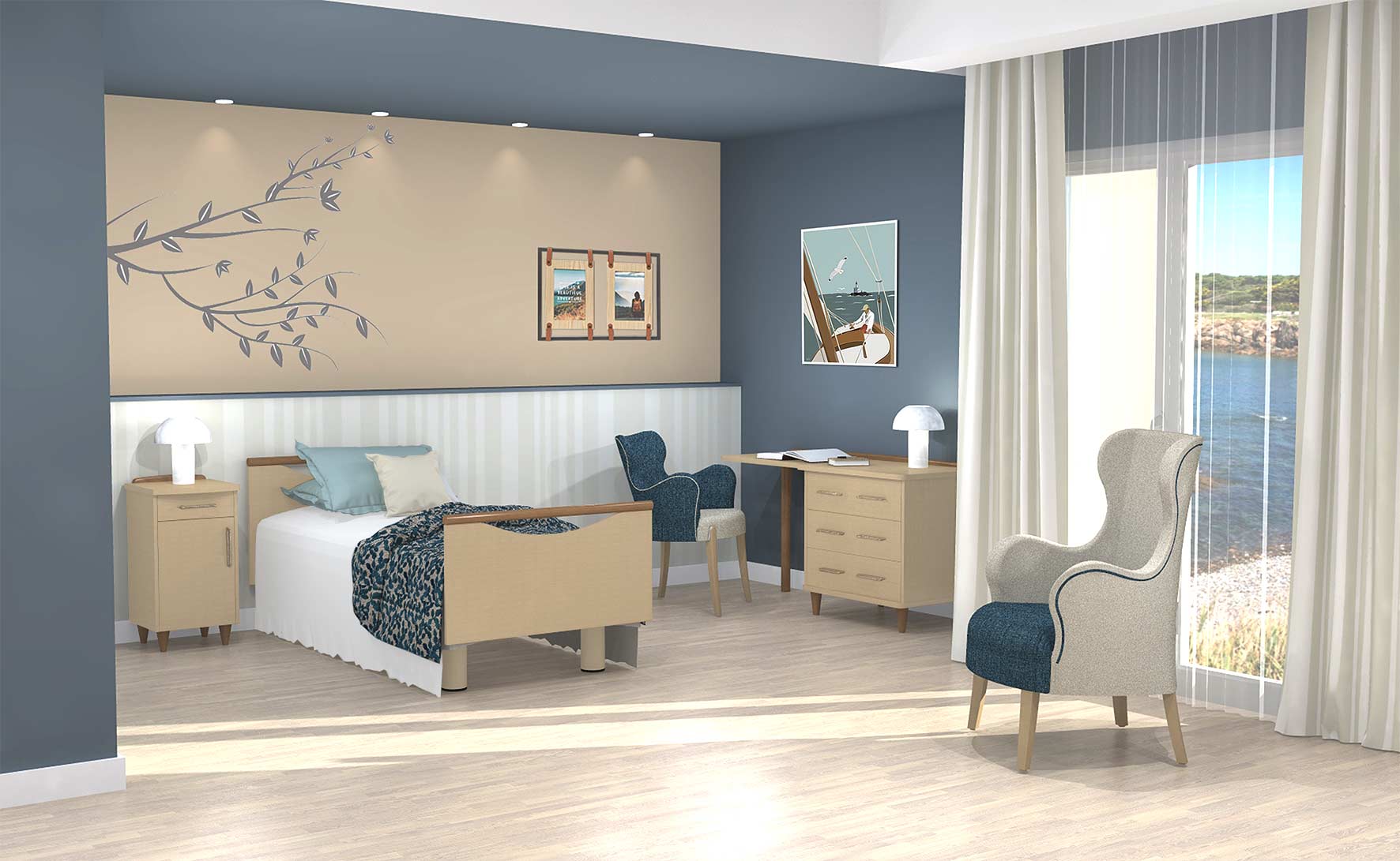 La chambre d’un résident en établissement de santé est un espace trop peu considéré. Souvent froid, austère et impersonnel, cet espace est pourtant important pour son bien-être. Il s’agit de son lieu de vie, calme et reposant où, plus que nulle part ailleurs, il doit se sentir « chez lui ». Dans cette optique, nous avons entièrement revu nos lignes d’hébergement traditionnelles ! Nous leur avons donné une ambiance unique et distinctive, où règnent chaleur et confort tout en gardant à l’esprit les contraintes techniques, d’ergonomie et d’entretien propres aux établissements de santé.